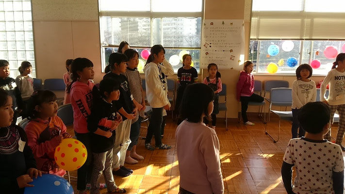 2時のクリスマスパーティーは「勇気100%」の歌ではじまり、輪投げと射的のゲームであそびました。