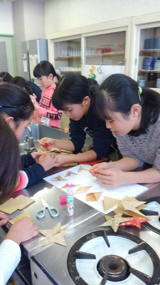 会場を飾るクリスマス飾りも折り紙で作りました。