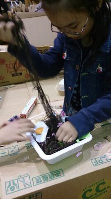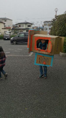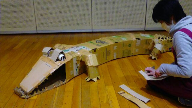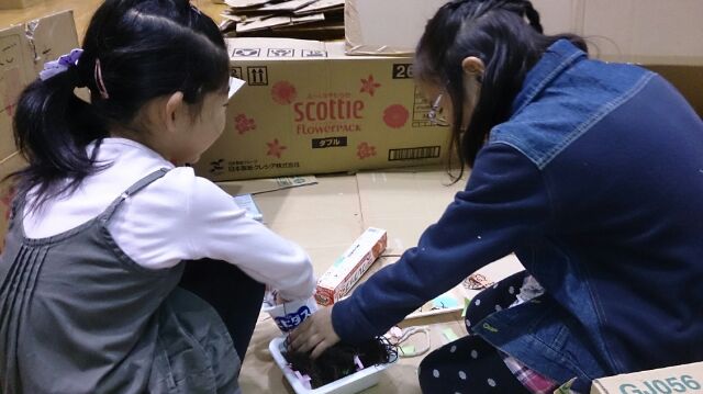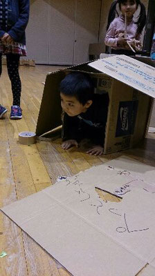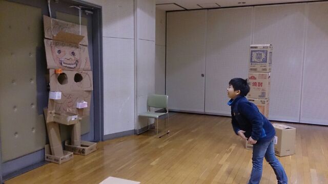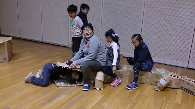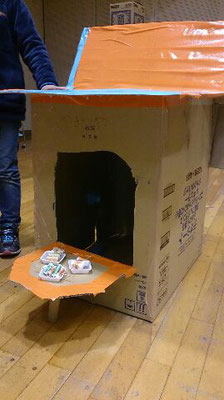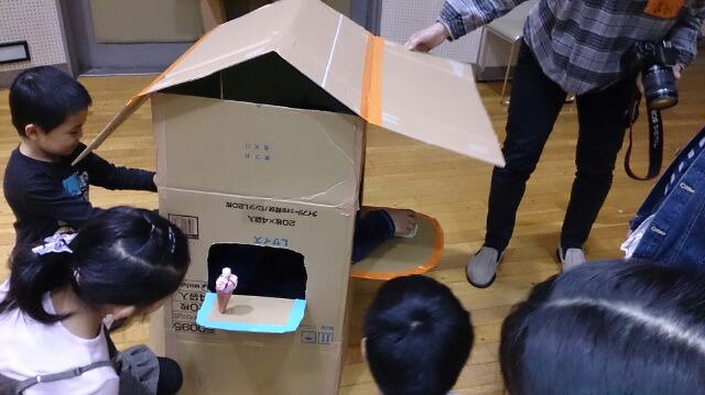 地元の節分祭りとかさなり、子どもたちの参加は、6名。大人の方が多いくらいでしたが、大人も子どももそれぞれの物を作って遊びました。お昼ご飯は作りかけのダンボールの家や、お店の中で。
