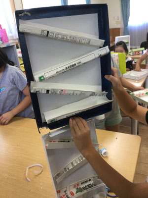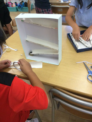 お菓子の箱の中に、牛乳パックでつくったレールをセットしてビー玉を転がすあそびだけど、レールの角度や次のレールに転がる位置とか、お友達のものをみていろいろ工夫していました。